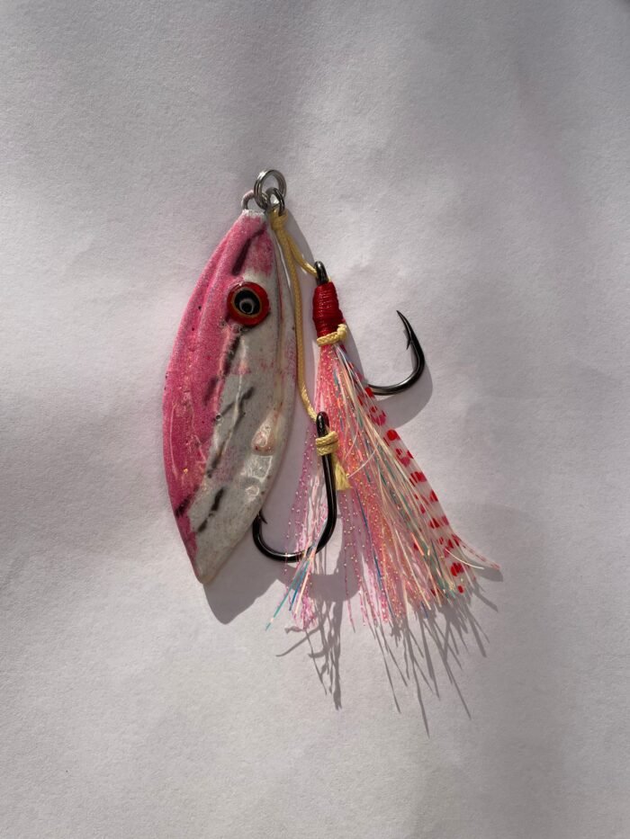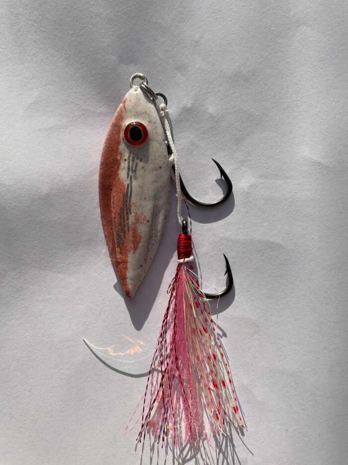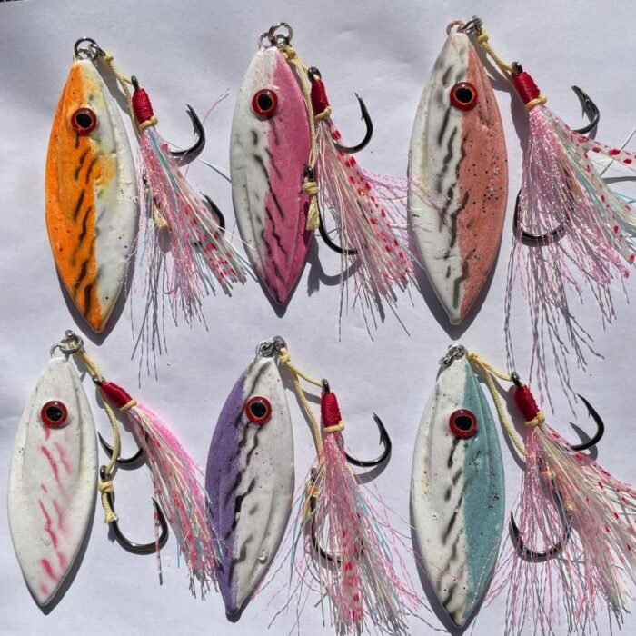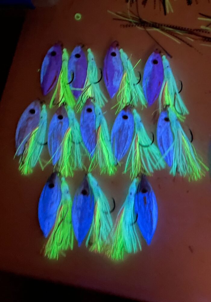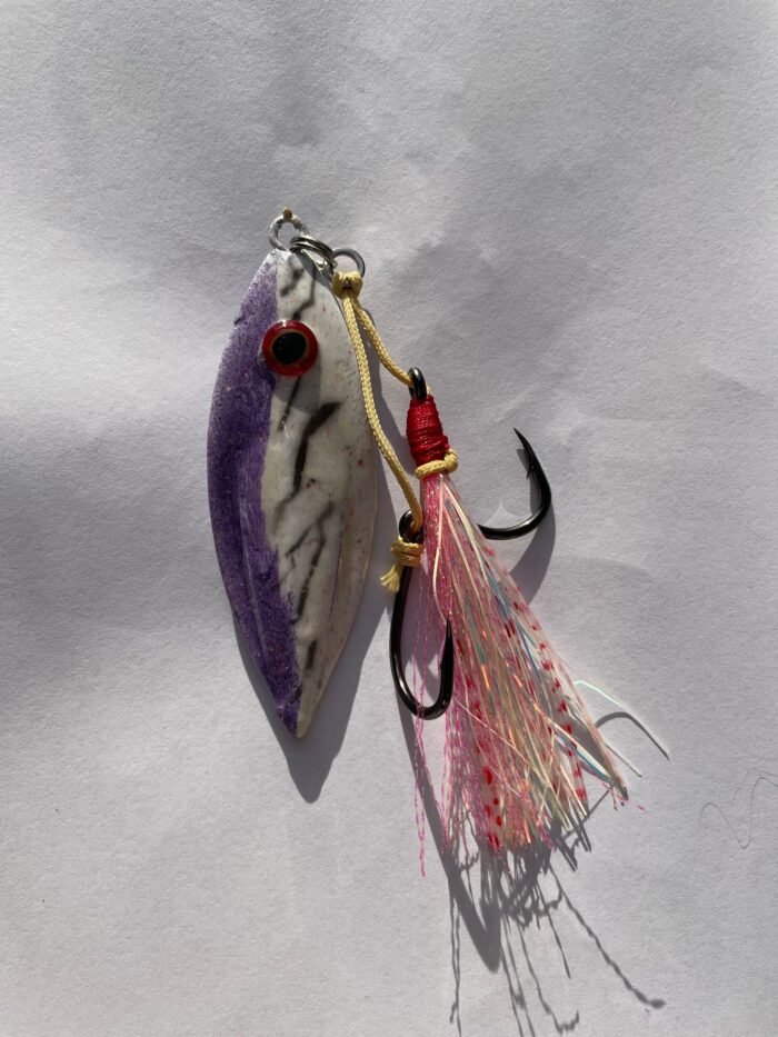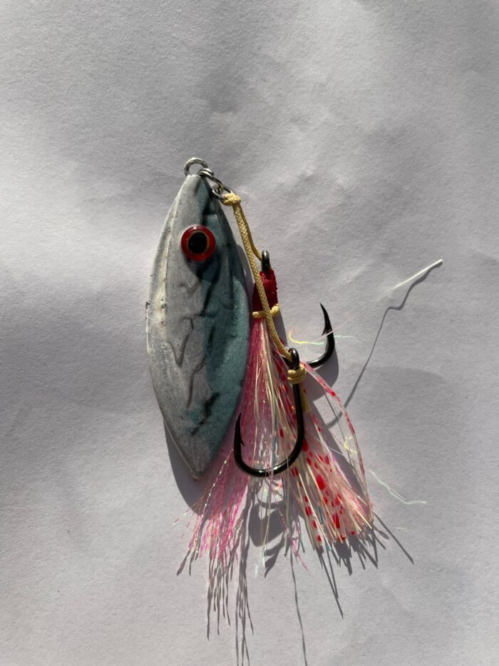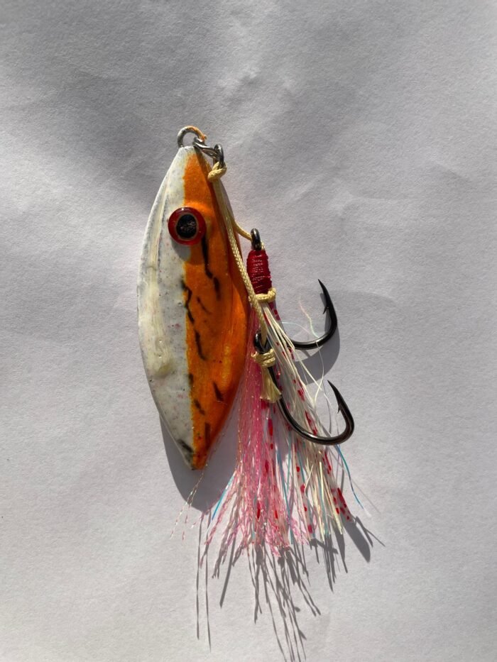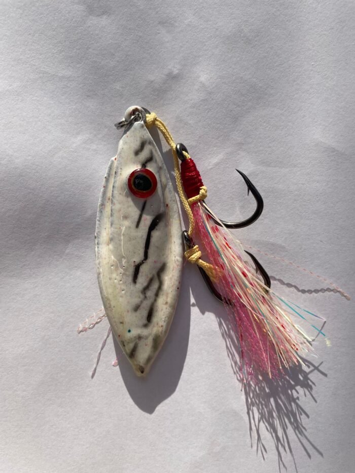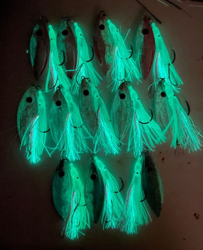 The Fleaty Flutter is a uniquely custom designed lead jig with an unbelievable flutter through the water column as it descends. Simply drop to the bottom vertical beside the boat, and let the lure do all the work. You can also work the lure by lifting and dropping the rod tip. Fitted with glow skirt and glow hook flasher for ultimate visibility.